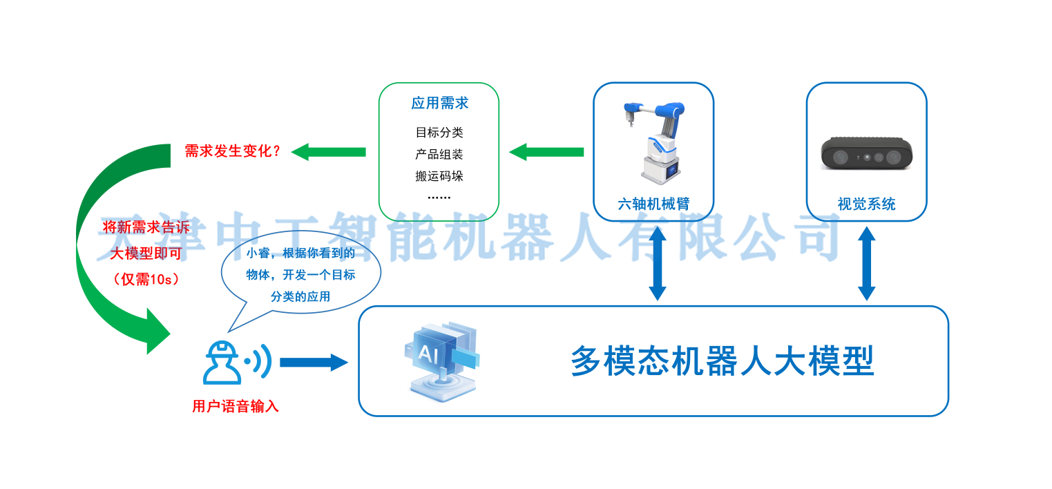 随着人工智能技术的飞速发展,特别是大模型(如深度学习模型、生成式AI等)的广泛应用,机器人领域正迎来一场前所未有的变革。大模型以其强大的数据处理能力、泛化能力和跨模态融合能力,为机器人提供了前所未有的智能水平。在这一背景下,研发了多模态机器人大模型与视觉协同系统,该系统以大模型为核心,以机器人为执行结构,以视觉系统为环境感知单元,可以快速地实现对多种应用需求的自主分析、理解和开发,可以有效的提高生产效率。同时,为有效的服务于用户的科研、开发等需求,该系统还开放大模型训练、部署的全部流程,并开放全部的机器人、视觉、语音的源代码,用户可以在此基础上,进行多个方向的探索和实践。