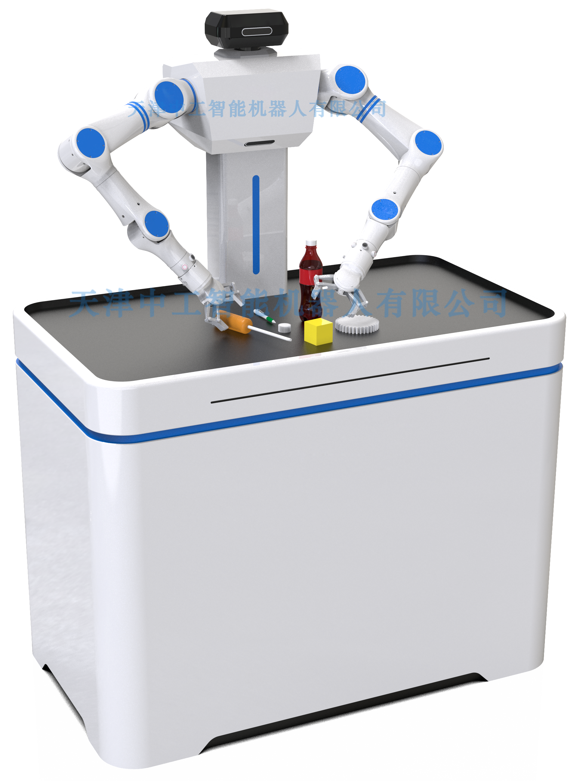 本方案的相关产品,均采用自研的七轴人形手臂,通过和视觉、语音、传感器等技术的深度融合,构建了“环境感知-决策-执行”闭环,形成多模态环境感知网络。所有产品均部署大模型技术,可以理解用户的复杂指令,推理出真实意图,并最终做出决策和反馈。例如,在工业分拣场景中,用户可以发出如“把桌上的螺丝刀放到货架上的蓝色盒子里”的语音指令,系统收到该指令后,进行如下推理:抓取目标(螺丝刀)、目标位置(桌上)、放置位置(蓝色盒子)、放置位置坐标(货架),然后,通过视觉系统的协同,自主生成该任务的分步骤指令,准确完成相关任务。同时,在任务执行过程中,可以融合视觉、触觉、位置等环境信息,不断优化任务执行效率。